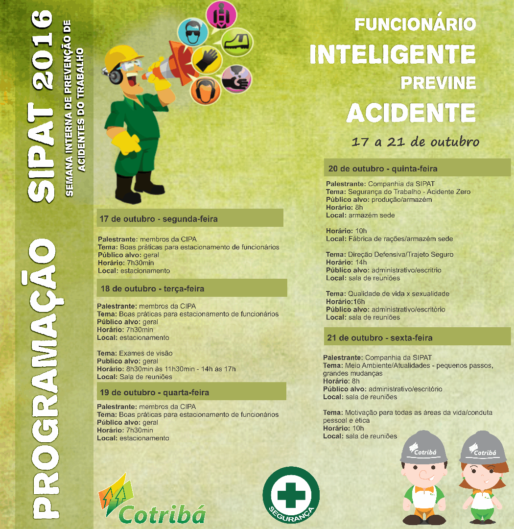 Amanhã, durante todo o dia, um médico oftalmologista estará realizando exames de visão. E, na quinta e sexta-feira, as atividades ficarão por conta da Companhia da SIPAT, um grupo especializado em abordar a prevenção de acidentes com cultura e arte. Serão três palestras na quinta-feira e duas na sexta. De forma bastante lúdica, os palestrantes deverão abordar questões como: Segurança do Trabalho - Acidente Zero; Direção defensiva/Trajeto seguro; Qualidade de vida x sexualidade; Meio Ambiente/Atualidades - pequenos passos, grandes mudanças; e, Motivação para todas as áreas da vida/conduta pessoal e ética.