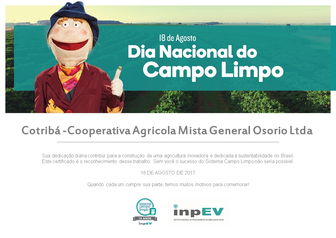 O dia também foi de reconhecimento. A Cotribá foi homenageada pelo inpEV pelo trabalho desenvolvido no gerenciamento de embalagens vazias de agrotóxicos.