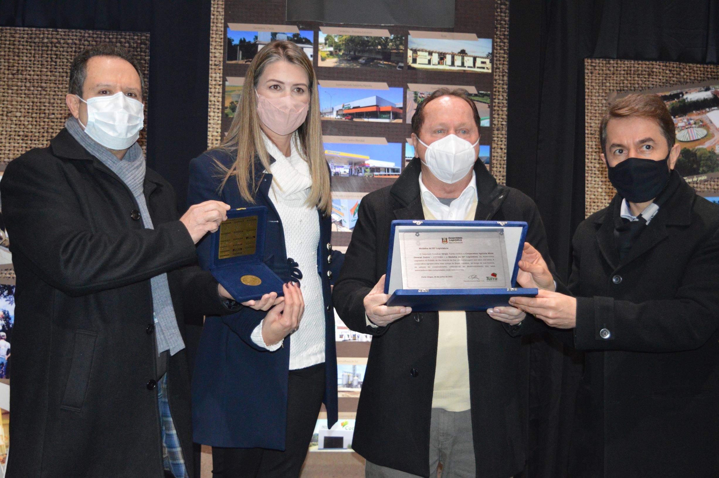 No ano em que celebra 110 anos, a Cotribá é agraciada com uma das mais importantes homenagens da Assembleia Legislativa do Estado do Rio Grande do Sul. Por indicação do deputado estadual Sérgio Turra (Progressistas), a cooperativa recebeu a Medalha da 55ª Legislatura. A entrega foi realizada na manhã de quarta-feira (30) junto à Asfuca, após a primeira reunião presencial dos membros titulares e suplentes dos Conselhos de Administração e Fiscal da Cotribá desde o início da pandemia. O encontro foi possibilitado com o cumprimento de todos os protocolos de higienização e distanciamento social exigidos pela vigilância sanitária e Secretaria da Saúde.