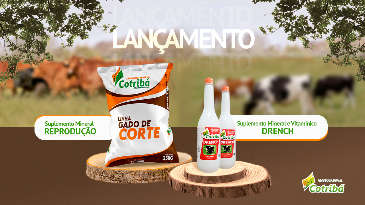 Sempre atento às necessidades do produtor e de nossos associados, o setor de Produção Animal da Cotribá acaba de trazer para você dois novos produtos que irão fazer a diferença na saúde e produtividade do seu rebanho: Suplemento Mineral Reprodução e Drench Cotribá.