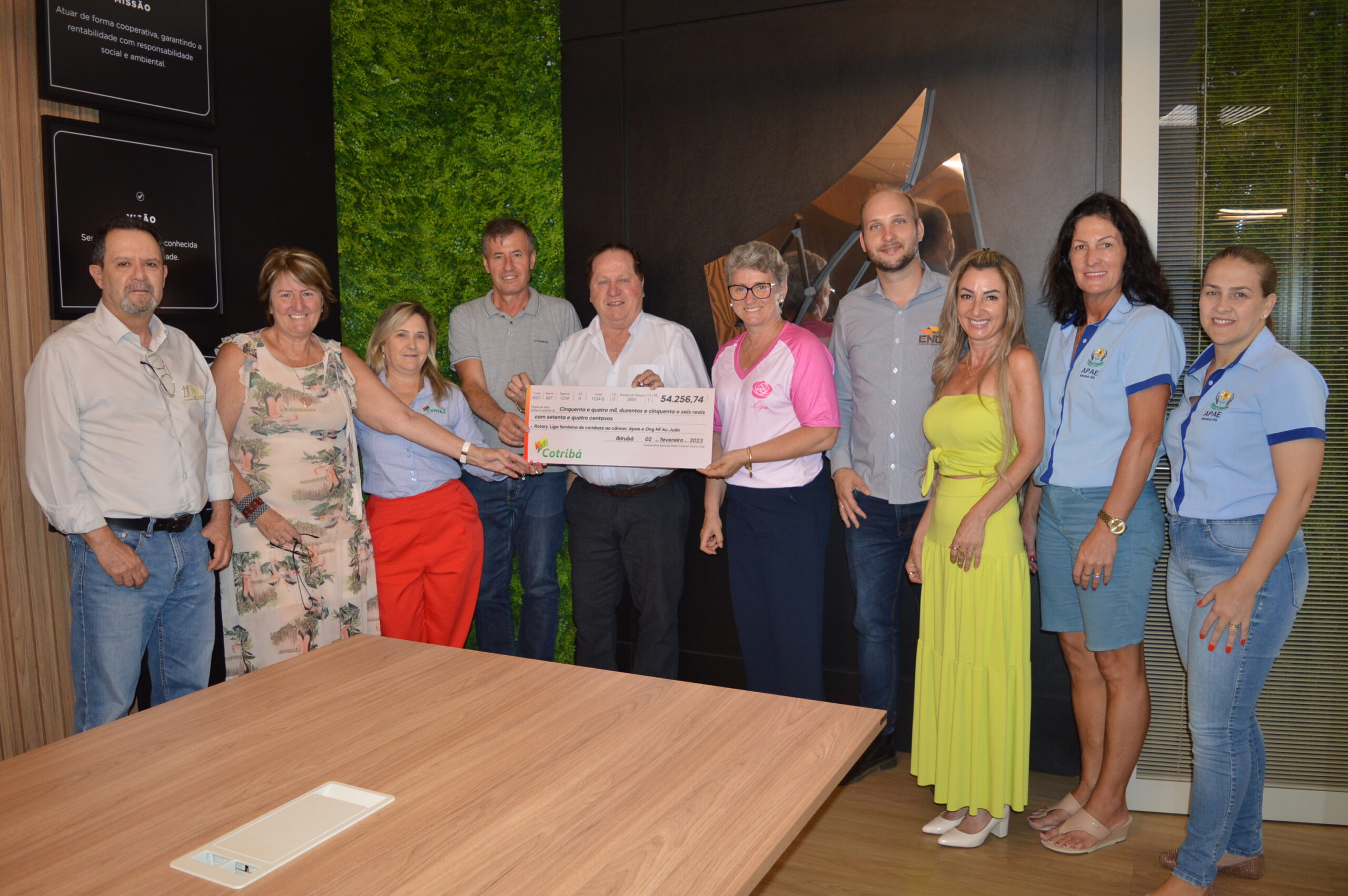 O valor, dividido de maneira igualitária entre a Liga Feminina de Combate ao Câncer, Rotary Club, ONG Mi AU Juda e Apae é resultado da arrecadação com o consumo de bebidas pago pelos participantes da Festa de Jubilados. O evento foi promovido pela cooperativa na última semana de janeiro, e reuniu mais de duas mil pessoas em uma grande homenagem aos mais antigos colaboradores em um momento de confraternização. Voluntários de todas as entidades trabalharam no evento. “Neste momento, não podemos deixar de parabenizar a todos que estiveram envolvidos nessa celebração e que, hoje, recebem este retorno. A Cotribá agradece a parceria de cada um de vocês”, afirmou o vice-presidente, Enio Cezar Moura do Nascimento.