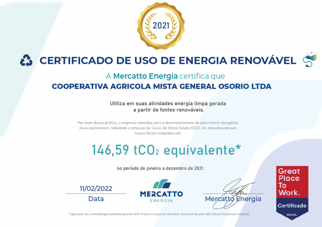 Cotribá recebe certificação de uso de energia renovável