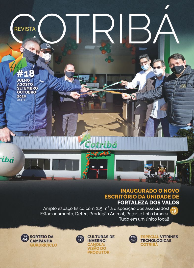 Revista Cotribá com temas relacionados ao cooperativismo! Inauguração do Novo Escritório da Unidade de Fortaleza dos Valos. Amplo espaço físico com 215 metros quadrados à disposição dos associados. Sorteio da Campanha do Quadríciclo.